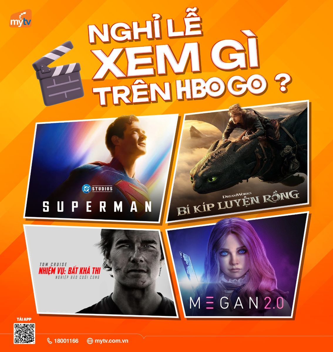 Với 50.000đ, bạn khó có thể mua được 1 vé xem phim rạp và bắp nước, nhưng lại có thể sở hữu cả thế giới điện ảnh HBO GO trên MyTV trong suốt 1 tháng. Còn chần chờ gì nữa, đăng ký ngay hôm nay để "luyện" Superman và Bí Kíp Luyện Rồng cùng gia đình nhé!