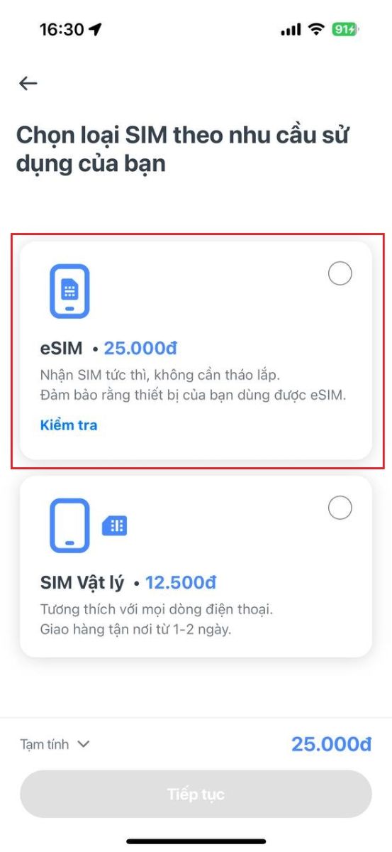 - Bước 4: Tại bước chọn loại SIM, hãy tích chọn "eSIM".
