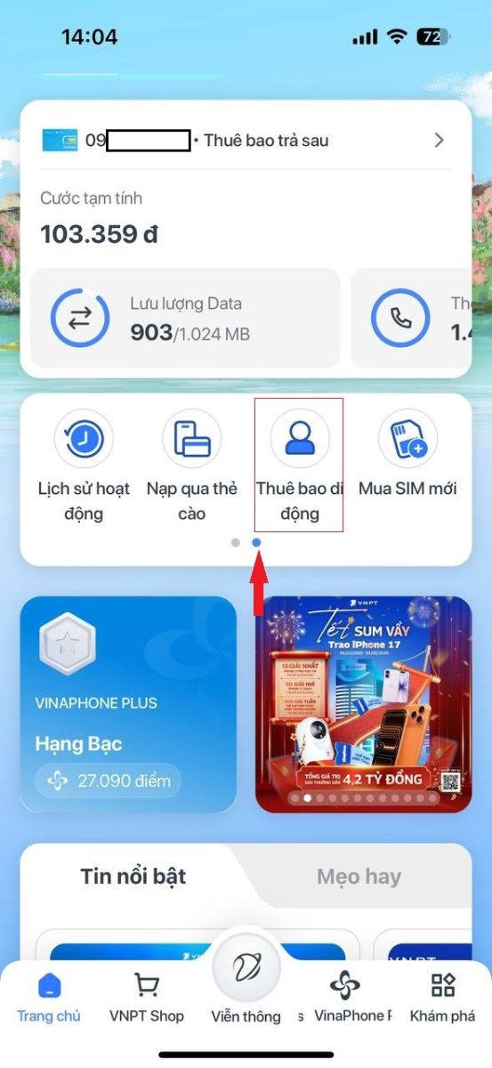 - Bước 2: Tại màn hình chính, chọn mục "Thuê bao di động" hoặc tìm kiếm từ khóa "Đổi eSIM" và lựa chọn tính năng “Đổi eSim”
