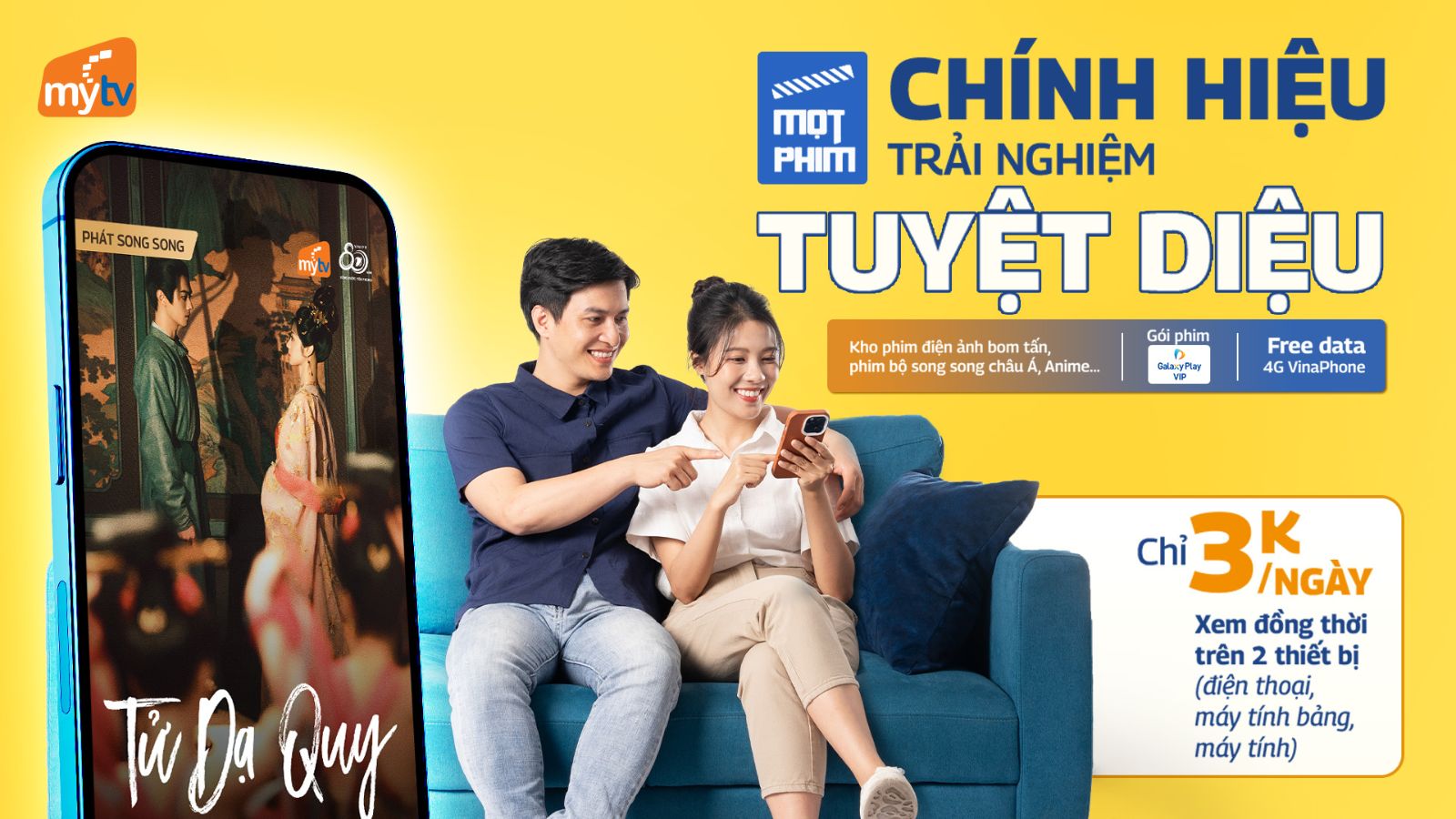 Gói cước Mọt Phim của MyTV có mức giá 20.000đ/30 ngày hoặc 3.000đ/ngày – miễn phí data 4G/5G VinaPhone, dành cho khách hàng đang sử dụng bất kỳ nhà mạng Internet/3G/4G nào tại Việt Nam. Đây là lựa chọn giải trí phù hợp với: giới trẻ, nhân viên văn phòng, người thích xem phim mọi lúc, mọi nơi.